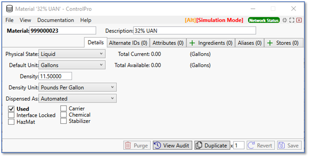 In the new materials screen, start by typing in the name of the material in the “description” field. In this example, we’re creating a liquid material called 28% UAN. Under the physical state drop-down field, select either dry or liquid. Next, select the default units. In this case, I’m using gallons. Most liquids use either gallons, quarts, or ounces, and most dry materials use pounds or tons. The next setting is density. The density can be found on the SDS sheet for the product. This is needed so ControlPro can properly convert amounts to another unit of measure. In v3.3, we now support density for dry products using pounds per cubic foot, or kilograms per cubic meter. Under the “dispensed as” drop-down field, select either automated or hand-add depending on how you plan on adding the material to the blend. Make sure the “used” box is checked so the material is available to assign to tickets and systems. Click save when done.