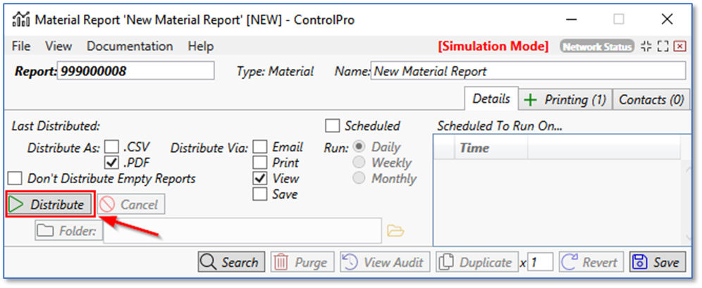 Go to the details tab. To view the report, check the PDF box and the View box. Then click distribute. It will use your search parameters to generate a PDF report and will open the file in your default PDF viewer. You can click the cancel button to stop a report from being generated.
