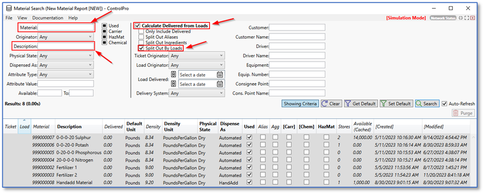 In the material search window, you can search for material using the ID number (material field) or by the material name (description field). Make sure to check the boxes “Calculate Delivered from Loads” and “Split out by Loads”. This will only show delivered amounts and exclude open tickets without loads. You can also select a load delivery date range, dispense type, attributes, customer ID, customer name, or originator. When your parameters are set, click the search button to see the results. Once the results are satisfactory, click the save button.