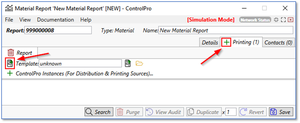 The next step is to setup the report template. Click the green plus sign on the printing tab. In the new window that appears, click the import template button. Select one of the three templates built-in to ControlPro. When finished, click save.