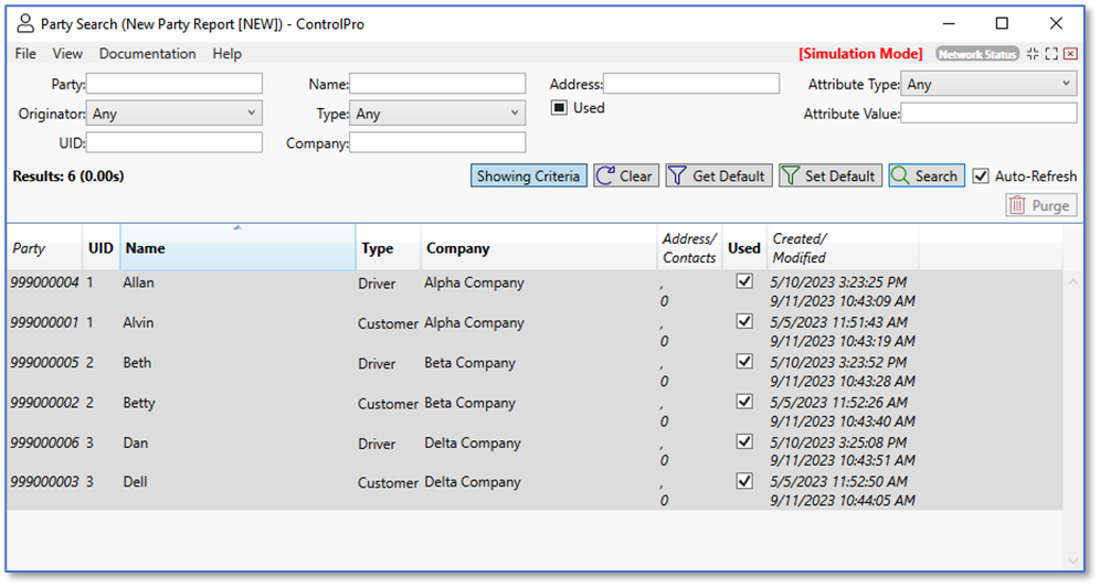 In the party search window, you can search for parties using the ID number (party field) or name (name field). You can also filter by company, type (driver or customer), UID, address, and attributes. When your parameters are set, click the search button to see the results. Once the results are satisfactory, click the save button.