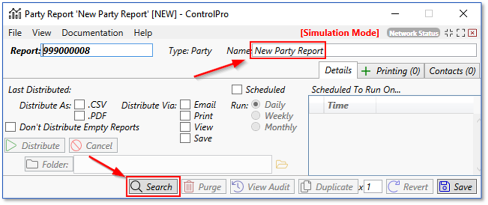 You can change the name of the report to what you wish in the name field. Then click the search button to open the party search window.