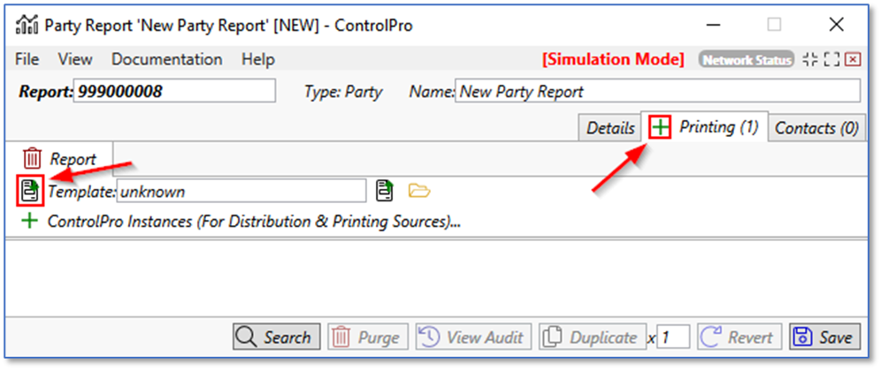 The next step is to setup the report template. Click the green plus sign on the printing tab. In the new window that appears, click the import template button. Select the party template built-in to ControlPro. When finished, click save.