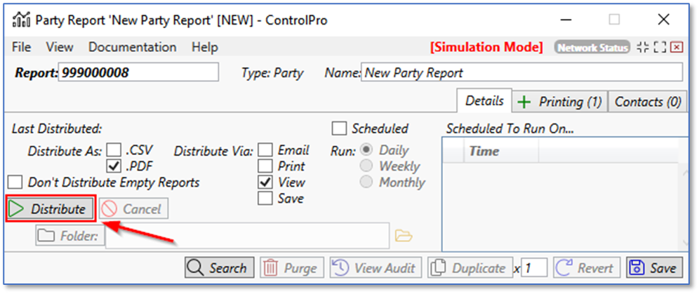 Go to the details tab. To view the report, check the PDF box and the View box. Then click distribute. It will use your search parameters to generate a PDF report and will open the file in your default PDF viewer. You can cancel the report being generated by clicking the cancel button.
