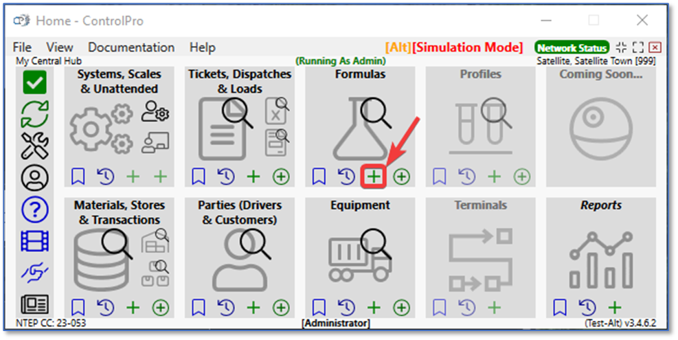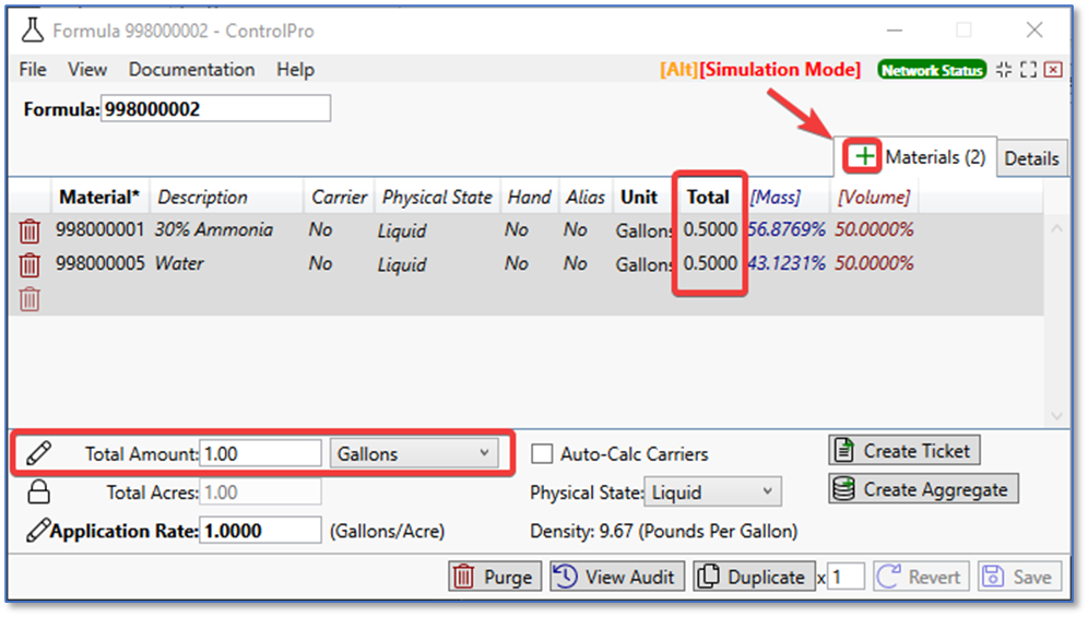 In the new formula window, click on the green plus sign on the materials tab. This will open the material search screen. Select the materials you want to add from the material search screen. Once all the materials are added, the next step is to add the amounts. In this example, I will do a 3:1 blend ratio. I added the weights under the total column. I applied three pounds to fertilizer 1, and one pound to fertilizer 2. The total amount field will automatically add up the weights to create a total. These amounts will be used to calculate the ratio when creating a new ticket.