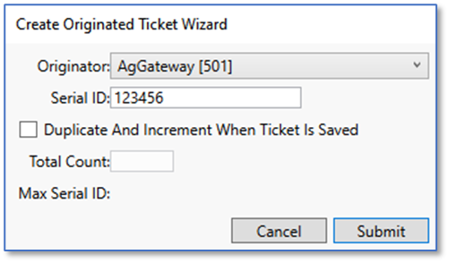The originated ticket window appears. Choose the originator you want from the drop-down menu. The serial ID is the ticket number after the originator prefix. When you choose the serial ID, you have the option to create duplicate tickets and increment the serial ID. To achieve this, check the box, and type in the total number of tickets you want in the total count field. If you only want one ticket, leave the box unchecked. When finished, click submit.