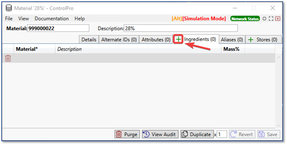 The ingredients tab is where you add your ingredients to the aggregate material. Click on the green plus sign to open the material search window.