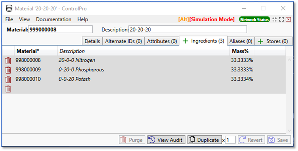 All percentages must add up to 100 exactly, or ControlPro will display an error and won’t let you save. This could be an issue if you have 3 blended ingredients of equal amounts. One third is 33.3333% repeating. All three parts add up to 99.9999%. You’ll receive an error that they don’t equal 100%. To get around this rounding issue, simply make one of the ingredients 33.3334%, and leave the other two at 33.3333%. Then all three will add up to 100%. One material being off by one ten thousandth of a percent is too small to be noticeable and won’t affect the blend ratios. When finished, click save.