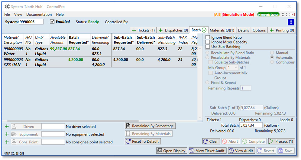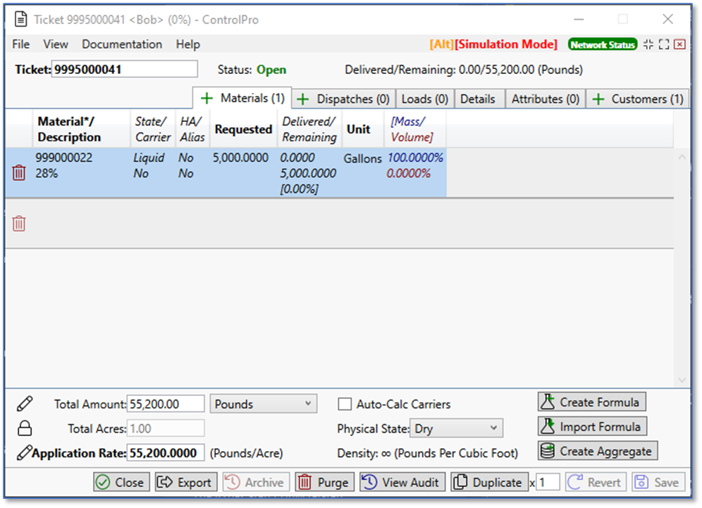 Next step is to create a ticket with that new aggregate material. In this example, I created a ticket with 5,000 gallons of 28%. Then I added the ticket to the system for processing.