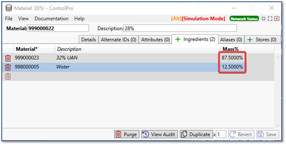Now that your individual ingredients are setup, we need to assign percentages. We’re diluting 32% with water to make 28%. When you do the math, that comes out to 87.5% (UAN) and 12.5% (water).