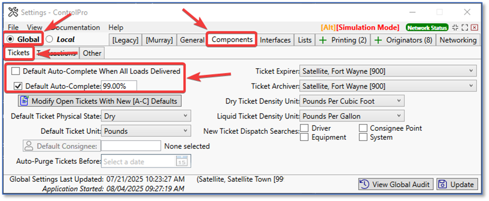 What we’re looking for are the two auto-complete settings. You can set up a ticket to auto-complete after all loads (batches) are delivered, or after a certain percentage of material is delivered. Most people keep the defaults of auto-complete at 99%, but I’ve seen customers set it as low as 95%. Where that’s set depends on how your business wants to run those tickets. Changing the system defaults by themselves will not affect tickets that have been already created. To update that setting for open tickets already in the system, click the “Modify open tickets new defaults” button. This will sync your changes to all open tickets in the system. If you don’t use this button, any changes you make will only apply to new tickets created after your changes.