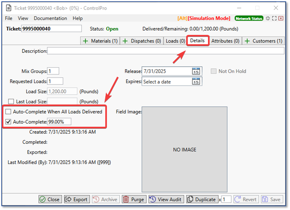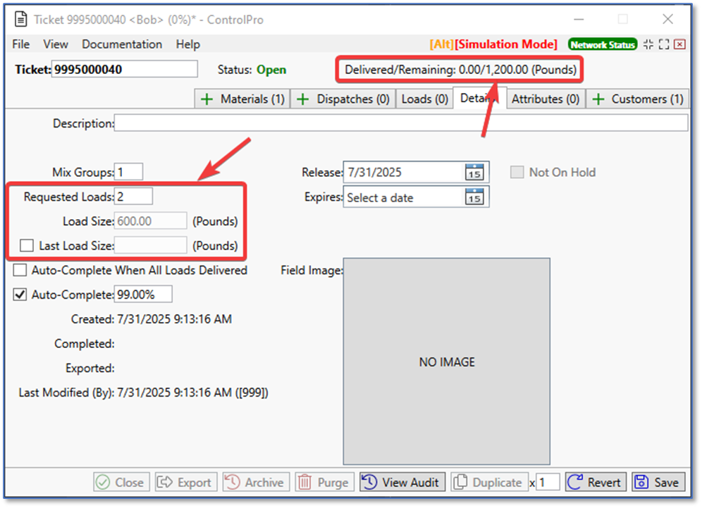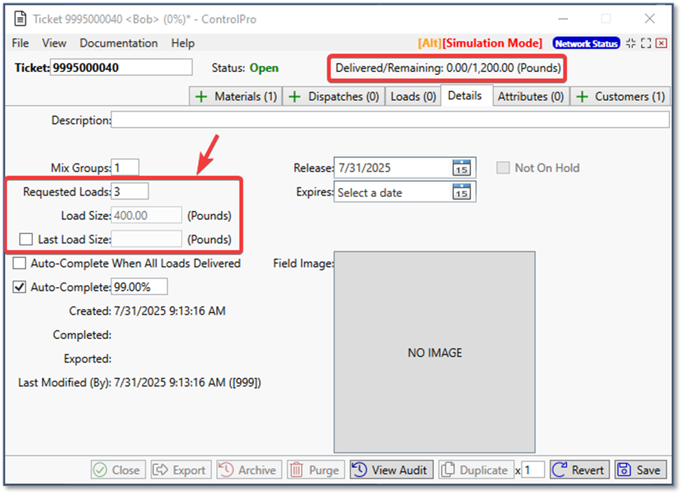 In that same window, we’ll show you the next settings to look for. In the details tab, you’ll see a setting for requested loads. If you know the customer will fill their ticket using multiple loads (batches), you can preset those loads when creating the ticket. In this example, the ticket total is 1,200 lbs. When requested loads is set to 1, it expects to deliver all the material in one load.