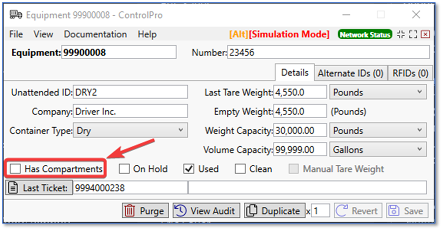 The next setting to look at exists under the equipment setup. Open a piece of equipment, and you’ll see a setting called compartments. This tells ControlPro that the equipment has compartments, and it will automatically enable sub-batch mode when this equipment is applied to a ticket. This is currently no way to determine the number of compartments or their capacity, only that the equipment has compartments. When opening the equipment search window, you will see a column with a checkbox that shows if it has compartments. You can toggle the setting from the search screen instead of opening the equipment itself.