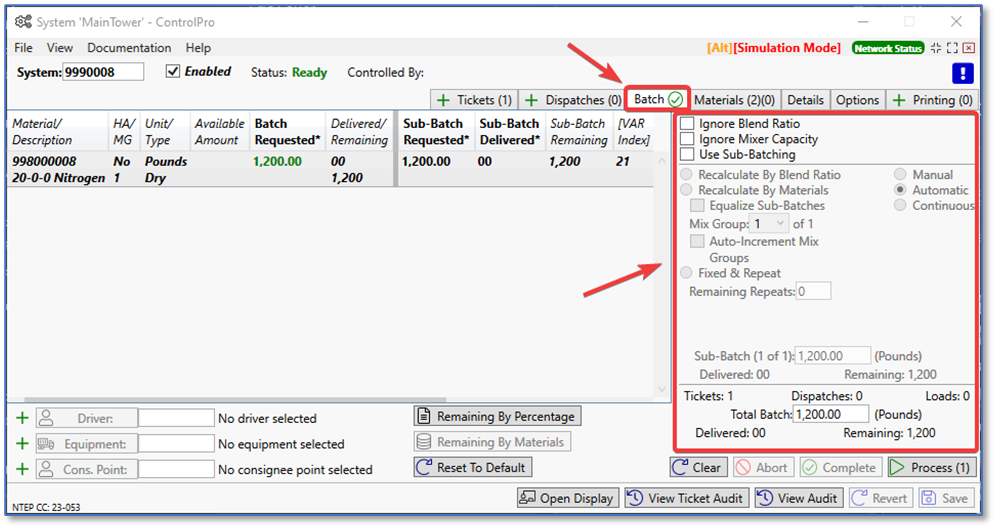 The next settings to look at are the batch settings on the system. Open a system screen, then go to the details tab. In here you’ll see the primary mixer capacity, and minimum/maximum batch size. Mixers are used in dry systems. All materials are combined in a mixer and then dispensed. If you have a liquid system, chances are you don’t have a mixer. The maximum batch size must always be equal to or lower than the primary mixer capacity. This prevents the automation from overloading the mixer and possibly breaking something. If a ticket amount exceeds the maximum batch size, then the system will split the load into batches not to exceed the maximum batch size. For example, if a ticket has 65,000 lbs. of material, but the maximum batch size is 55,000 lbs, then you’ll need to run two loads (batches). One for 55,000, and the other for 10,000. The system will not allow you to run a load over 55,000 unless you increase the maximum batch size.