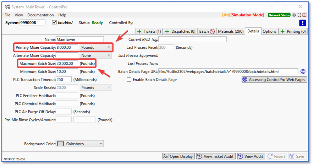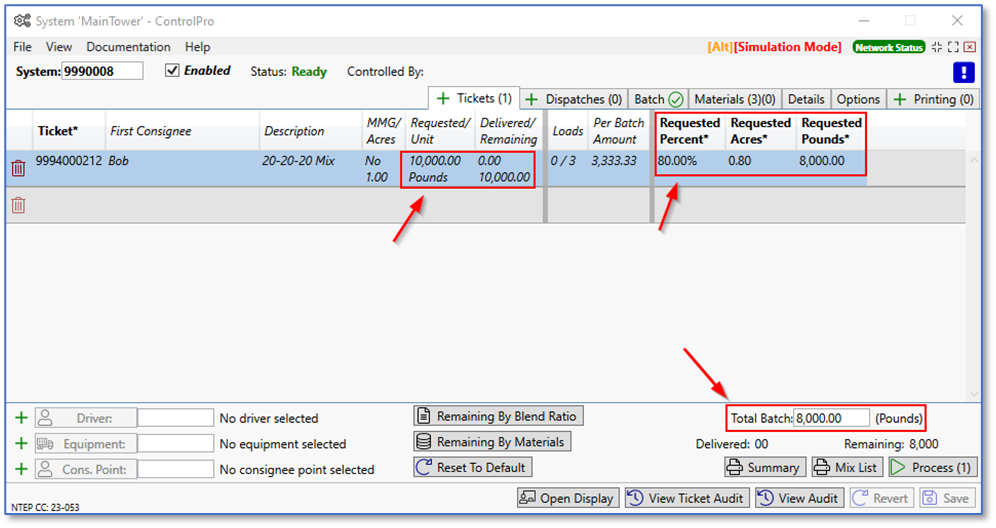 I loaded a ticket into the system with the requested amount of 10,000 lbs. Notice in the total batch pounds field, it’s 8,000 lbs. That’s because of the primary mixer capacity limiting the batch size. You can increase that amount up to the maximum batch size. The system will never let you deliver a batch larger than the maximum batch size.