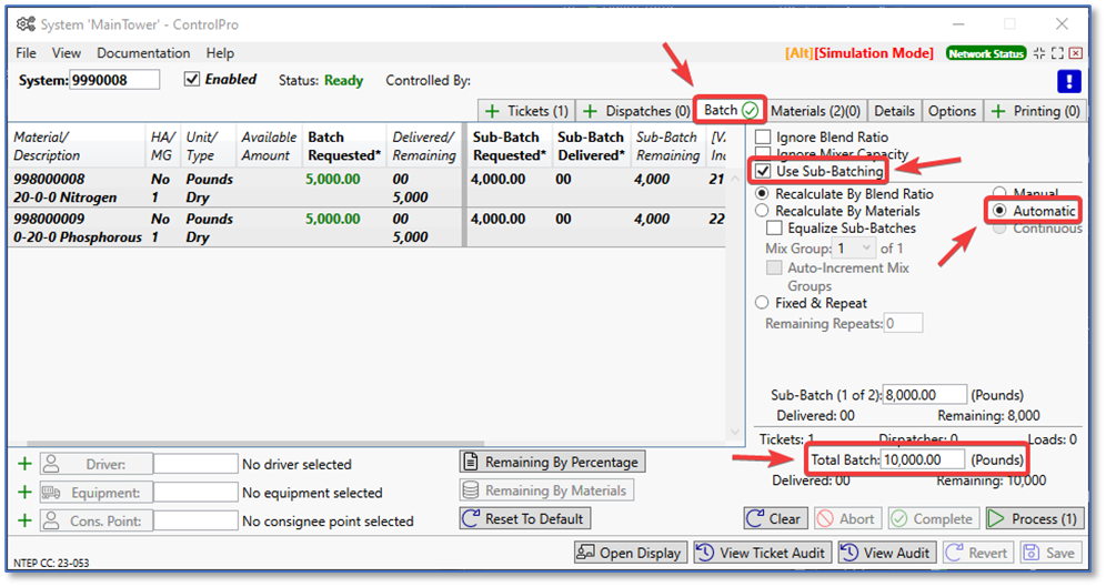 To achieve this, load the ticket into the system and go to the batch details tab. Under there, check the box to use sub-batching. Then click automatic. Under the total batch pounds field, change it from 8,000 lbs to 10,000 lbs. When ready, click process.