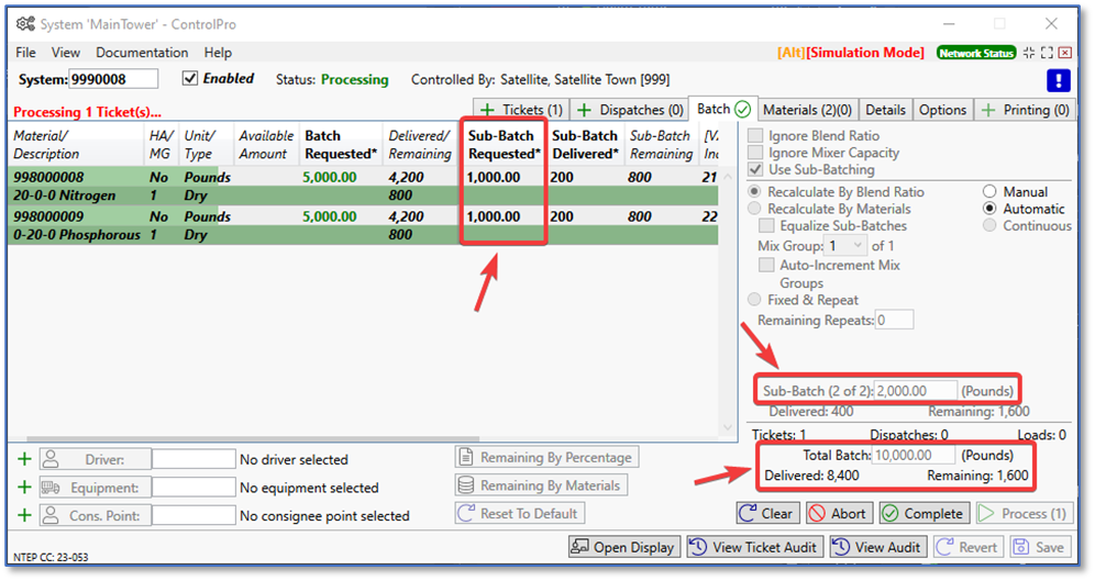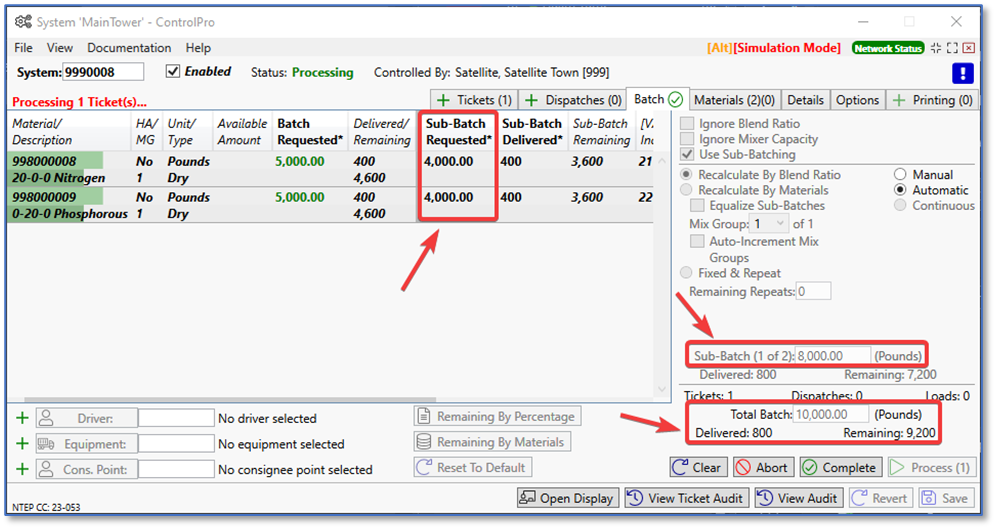 When processing, you’ll see it mix and process the first batch. The first batch is 8,000 lbs., two materials with 4,000 lbs. each. It also lists it as Sub-Batch 1 of 2.