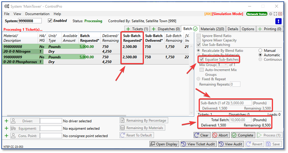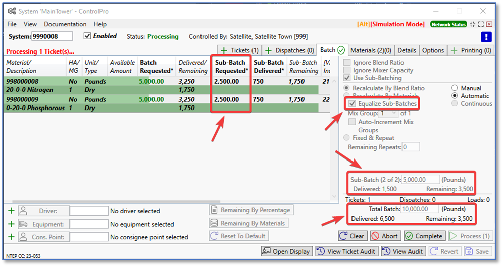 In the screenshot below, we are processing a ticket with 10,000 lbs. of material. When choosing equalize and setting the total batch pounds to 10,000, it creates two sub-batches. Sub-batch 1 of 2 is 5,000 lbs.