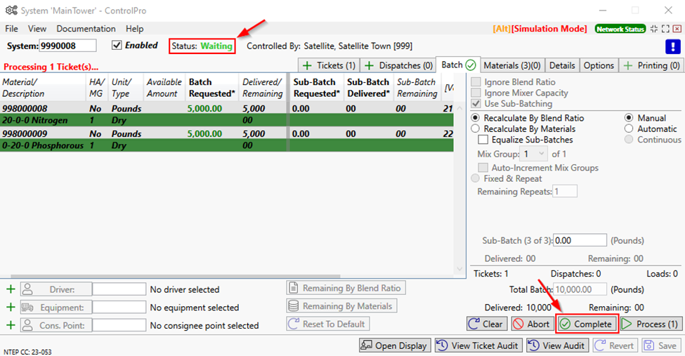 Once the sub-batch is delivered, you see the delivered amounts were updated, and the remaining batch amount has been calculated for you. Also, the system status will change to “waiting”. ControlPro is waiting for you to manually start the next sub-batch. When you’re ready, click the process button again to start the next sub-batch.