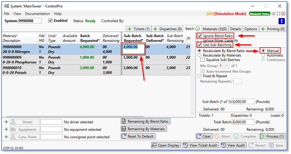 If you need to deliver a ticket and omit one or more of the materials, you can achieve that with manual sub-batching. Add the ticket to the system, highlight the ticket, then go to the Batch tab. Check the box to ignore blend ratio. Then check the box to use sub-batching and place it in manual mode. Once all three are set, you can double click the field under the sub-batch requested column. Once the cursor appears, you can edit the amount. Set to zero if you want to omit the material, or any other amount if you want to adjust it.