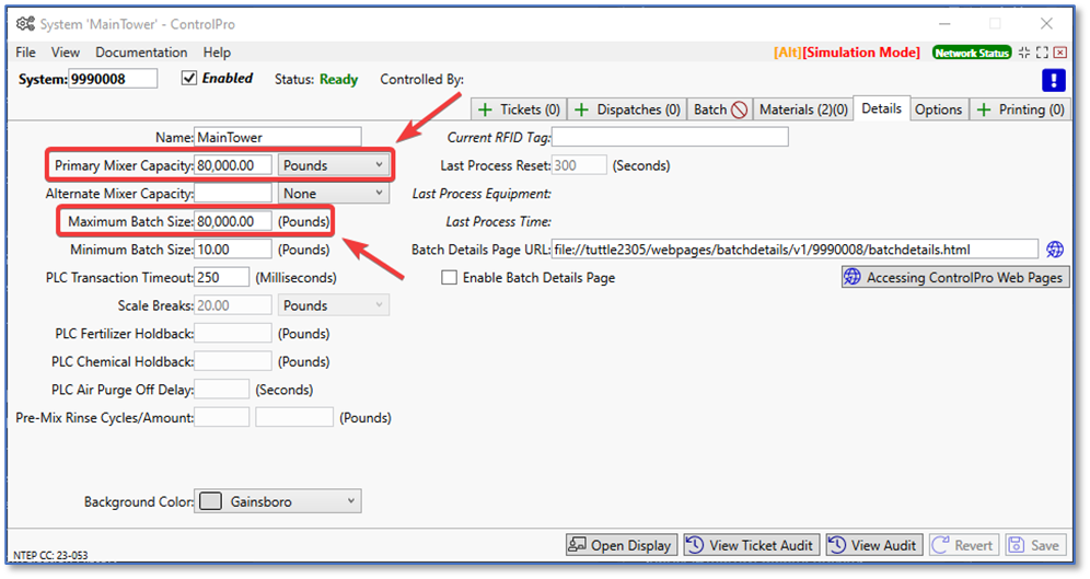 Here’s the part where we need to do a little math. The truck has a total capacity of 24,000 lbs. with two compartments at 12,000 lbs. each. We can fill up the first container and load the remaining into the second, or we can equalize the amount of material in each compartment. You can always ask the driver if they prefer one way or the other. In this example, I will equalize the load across both compartments. That comes out to 10,000 lbs. in each compartment. Under the batch details tab, in the sub-batch pounds field, fill in 10,000 lbs. When ready, click process to run the first sub-batch.