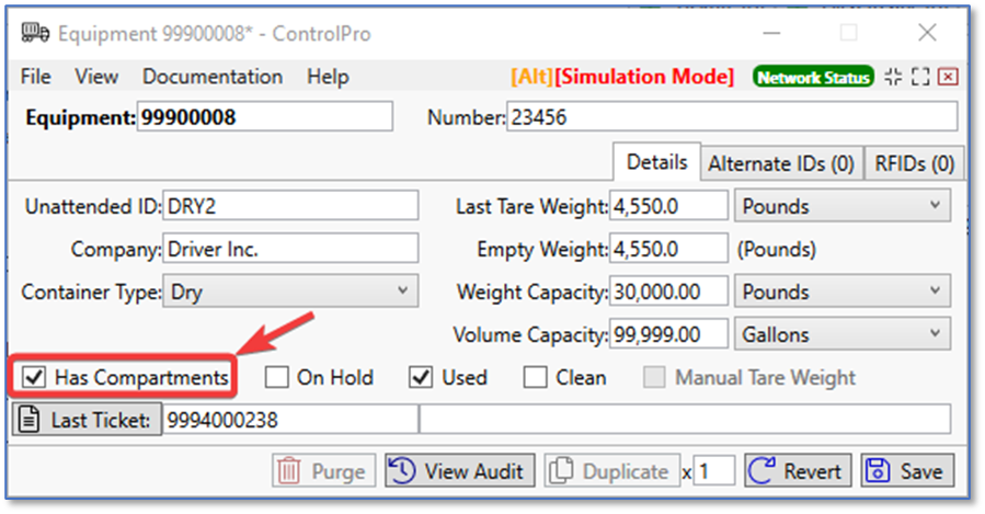 In the following example, we are using a mixer with a capacity of 80,000 lbs. The ticket has a requested amount of 20,000 lbs. and the truck has a capacity of 24,000 lbs with two compartments (12,000 lbs each). To enable compartments, open the equipment and check the compartments box.