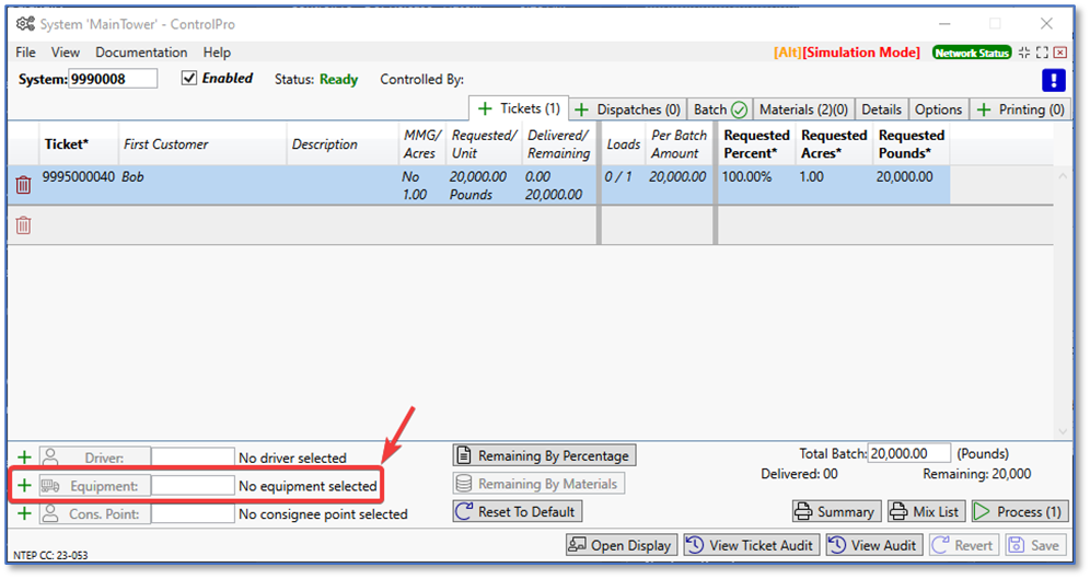 I loaded a ticket into the system with the requested amount of 20,000 lbs. The next step is to add the equipment to the ticket. At the bottom left of the system screen, under the tickets tab, click on the green plus sign next to the equipment field. In the equipment search window that pops up, double click on the equipment you want to assign.