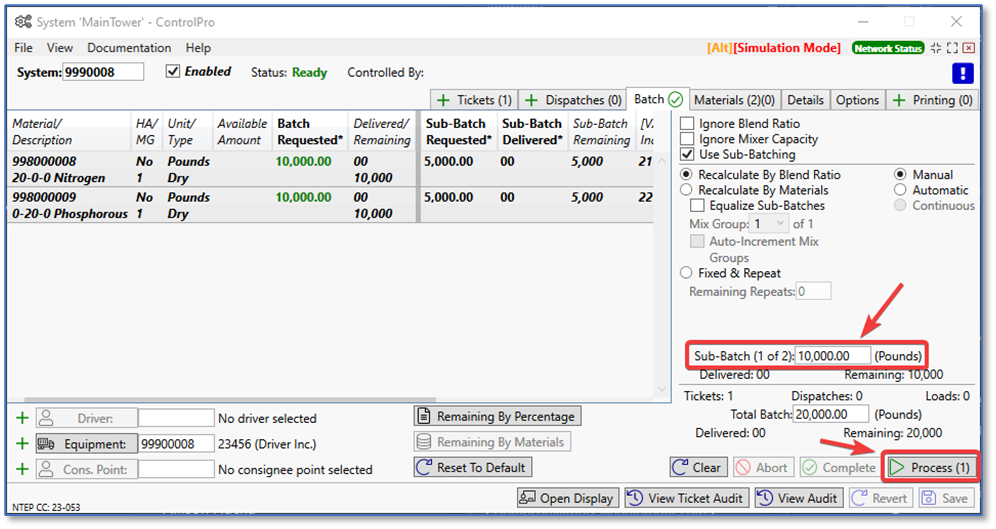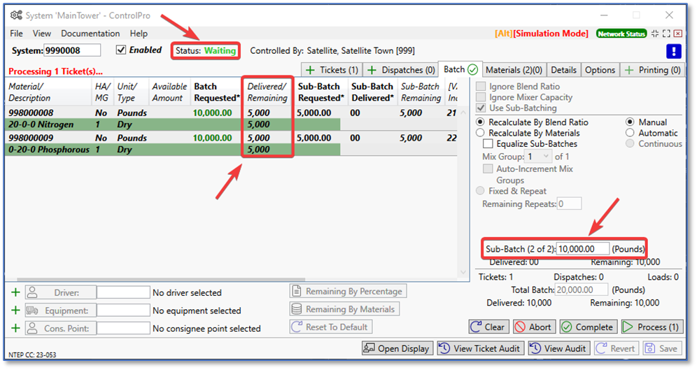 After the first sub-batch is delivered, you can see the 10,000 lbs. already delivered (5,000lbs each of two materials). At this point, ControlPro goes into a “waiting” status. This is when you tell the driver to pull the truck forward so you can fill the second compartment. At the bottom right, fill in the amount you want to deliver. We only have 10,000 remaining, and that’s automatically filled in. If you’re running more than two sub-batches, make sure to type in the number you want to run for that sub-batch. When ready, click the process button to run the second sub-batch.