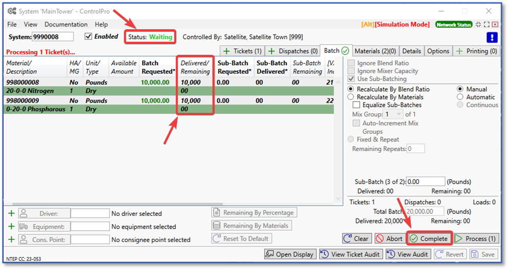 When all sub-batches have been delivered, ControlPro goes into “waiting” status again. Click the “complete” button at the bottom of the screen to close the ticket. The ticket will then clear itself from the screen.