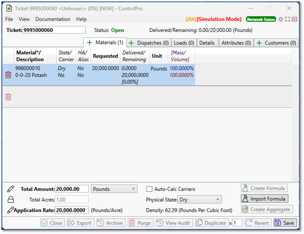 Here is an example of a ticket with 20,000 pounds of material. The truck carrying this load can only hold 12,000 pounds, so we’re pre-setting two dispatches, each with 10,000 pounds.