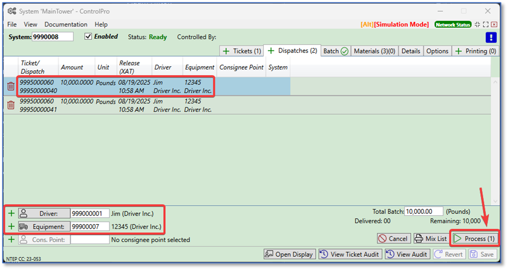 When the dispatch is filled out, you can process the load by selecting the dispatch under the dispatch tab, then clicking the process button. When you select the dispatch, it will fill in the batch pounds, driver, and equipment for you. When ready, click process.