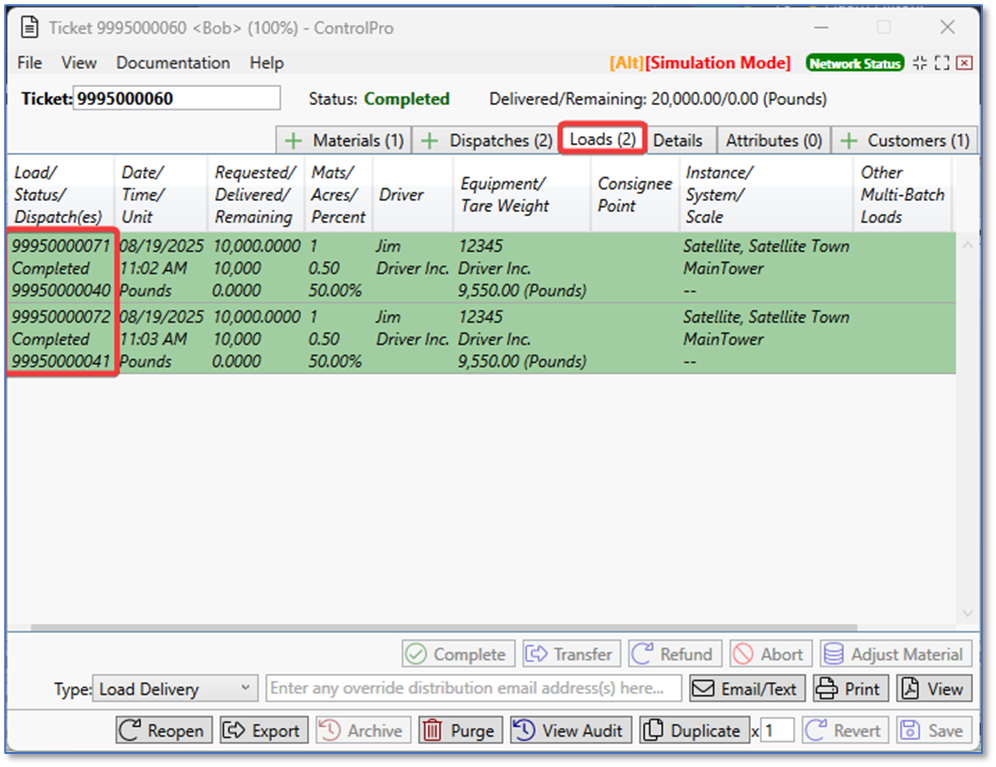 Once every dispatch is processed, the ticket will close based on your auto-complete settings. If you open the ticket after it’s completed, you’ll see under the dispatch and loads tabs that they are all complete. Keep in mind that dispatch numbers use their own sequence separate from load numbers. You can always search for a ticket using the ticket number, load number, or dispatch number.