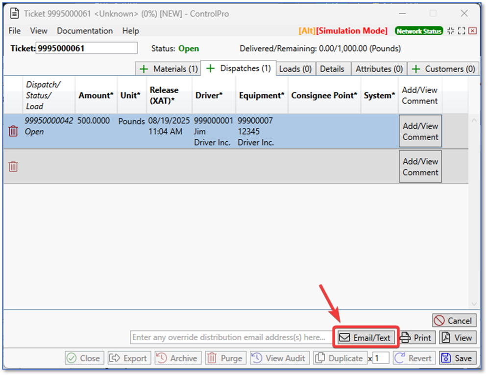 Once the contact information is added, create the ticket with a material and add a customer. Then go to the dispatch tab and enter in the dispatch information. Once saved, click the Email/Text button to send out the dispatch notifications.