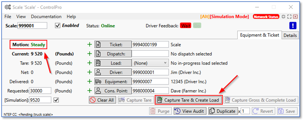 We’re simulating a tare weight of 9,520 lbs. with a requested amount of 30,000 lbs. When the scale motion is steady, click the capture tare and create load button.