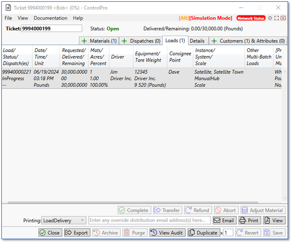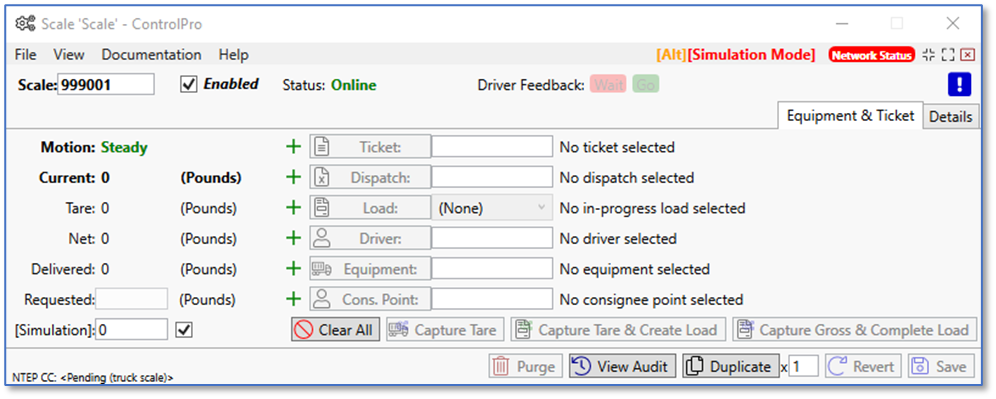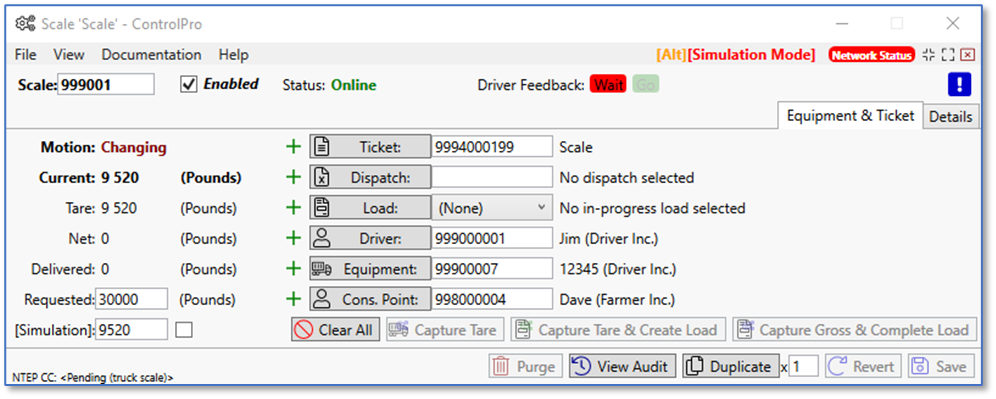 Below I added a ticket along with driver, equipment, and consignee point. At the bottom left, you’ll see the boxes for requested and simulation. These fields are editable while in simulation mode. When simulation mode is turned off, the simulation field disappears, and the requested field is locked and can’t be edited. Towards the top left, you’ll see a section for motion. While the scale is in motion, you cannot capture the weight.