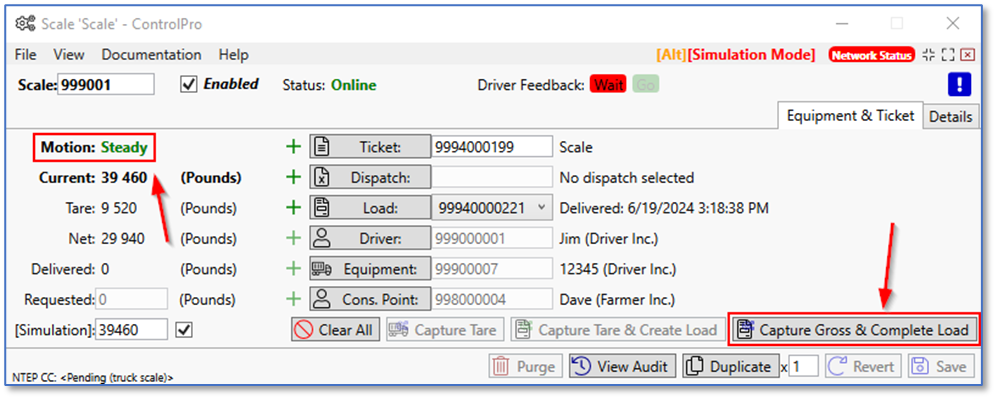 I loaded the ticket back into the scale system. Once the motion is steady, the capture gross and complete load button activates itself. I typed in the weight of 39460 simulated gross weight. When the scale motion is steady, click the capture gross and complete load button.