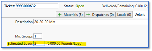 From the preceding screenshots, ticket 0632 will default to 2 batches of 6,000 pounds each, for a total of 12,000 pounds.