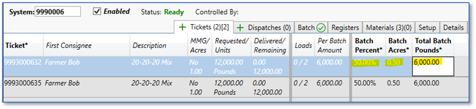 Once assigned to a system, the defaults will show up on the System Detail’s Tickets tab. The requested amount from each ticket can be modified by typing directly into the grid cells for Batch Percentage, Batch Acres, or Total Batch [Amount*]. Modifying the ticket amounts will modify the system’s Total Batch amount.