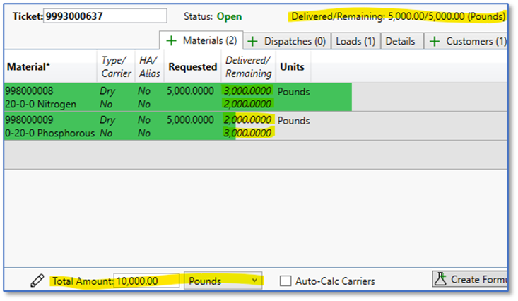 An Example, consider ticket 0637 which has a previously delivered batch for 5,000 pounds, while the ticket as a whole is for 10,000 pounds total. This leaves 5,000 pounds remaining on the ticket. The ticket is supposed to be for a 50/50 blend of the two materials, but 3,000 pounds of Nitrogen and 2,000 pounds of Phosphorous were delivered (for whatever reason).