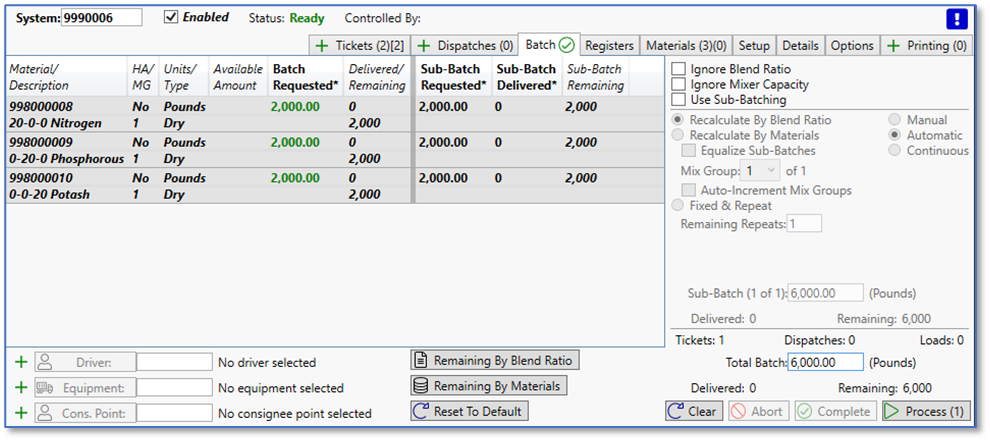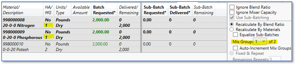 Clicking this button would configure ticket 0637 to deliver 5,000 pounds of material; 2,500 pounds of both Nitrogen and Phosphorous. This sets up the ticket’s second batch to match its blend.