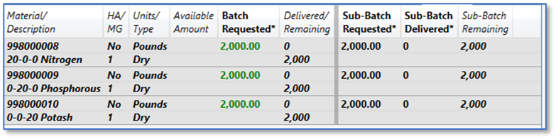 Clicking this button would configure ticket 0637 to deliver 5,000 pounds of material: 2,000 pounds Nitrogen and 3,000 pounds of Phosphorous. This sets up the ticket’s seconds batch to top off its materials.