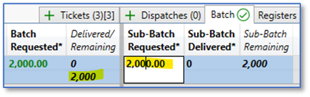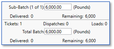 At the bottom of the panel is a summary of the sub-batch. The Sub-Batch total requested is first. This can be edited between sub-batches if Manual mode is selected. Next are the amounts delivered and remaining in the current sub-batch. Below, the total counts of tickets, dispatches, and loads are listed.
