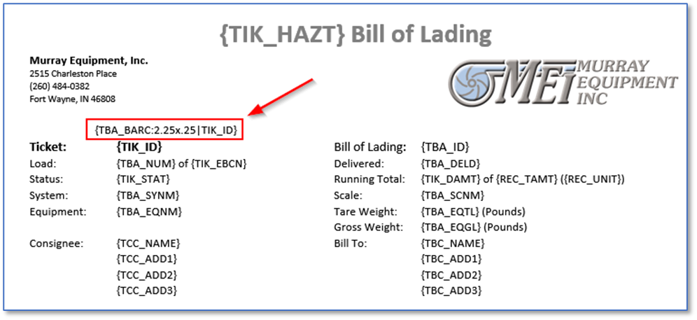Using the code above, the software will generate a barcode for the ticket number. Below is an example of the code in the template document.