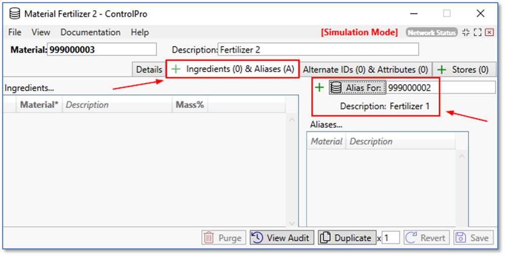 In the material window, go to the Ingredients and Aliases tab. In there, it will list the parent material under the “alias for” field. It will also include the description name of the product. As you can see here, Fertilizer 1 is the parent material, and Fertilizer 2 is the child material. Let’s open up the material window for the parent material, Fertilizer 1.